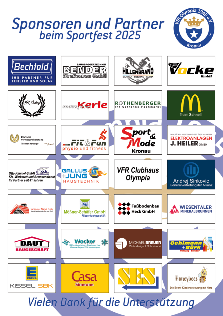 im Namen des gesamten VfR Olympia Kronau möchten wir uns herzlich für Eure großartige Unterstützung anlässlich unseres 80-jährigen Jubiläums-Sportfests bedanken. Ohne Eure Hilfe, Eure Zeit und Eure großzügigen Beiträge wäre dieses besondere Fest nicht möglich gewesen.