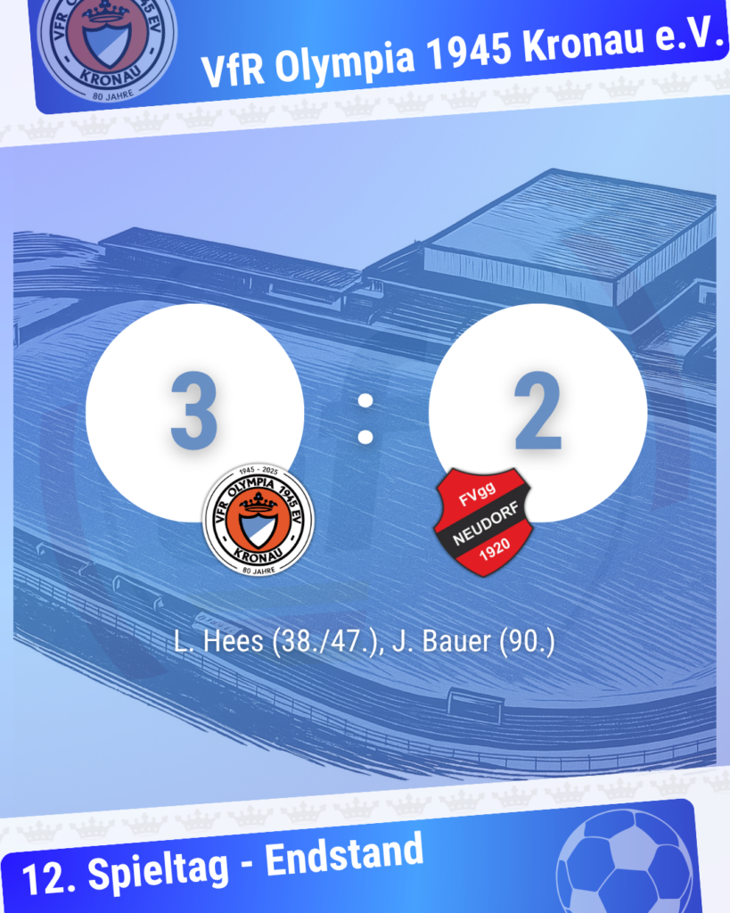 Der VfR Olympia 1945 Kronau e.V. feiert einen 3:2-Erfolg der ersten Mannschaft gegen die FVgg Neudorf mit einem späten Treffer in der Nachspielzeit.